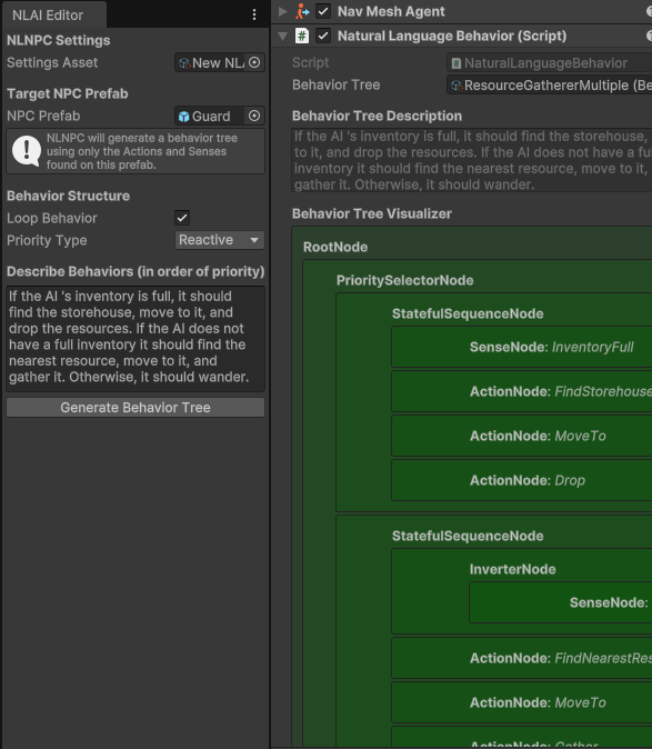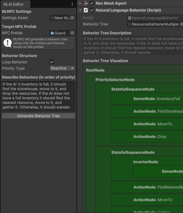 Leverages LLM's to use only natural language to generate complex behavior trees for non-playable characters with modular behaviors.